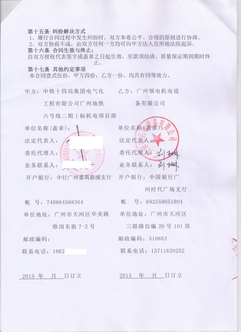 以下為淞江集團委托授權商廣州*電機電設備有限公司與中鐵十四局集團電氣化工程有限公司廣州地鐵六號線二期1標機電項目部簽訂管道連接件購銷合同,該合同為真實有效的,請勿修改,請勿轉載,該合同只作為*貨證明,不作為其他用途,謝謝合作。